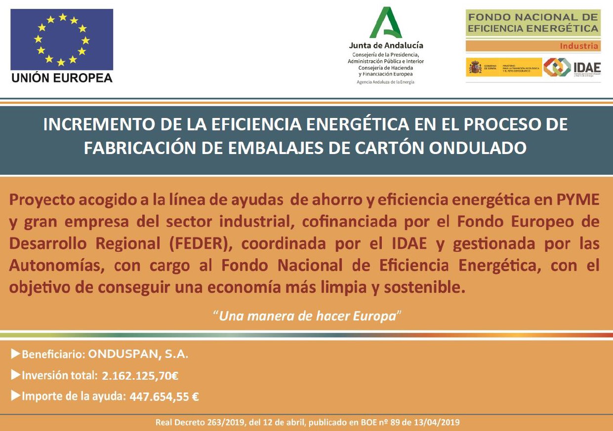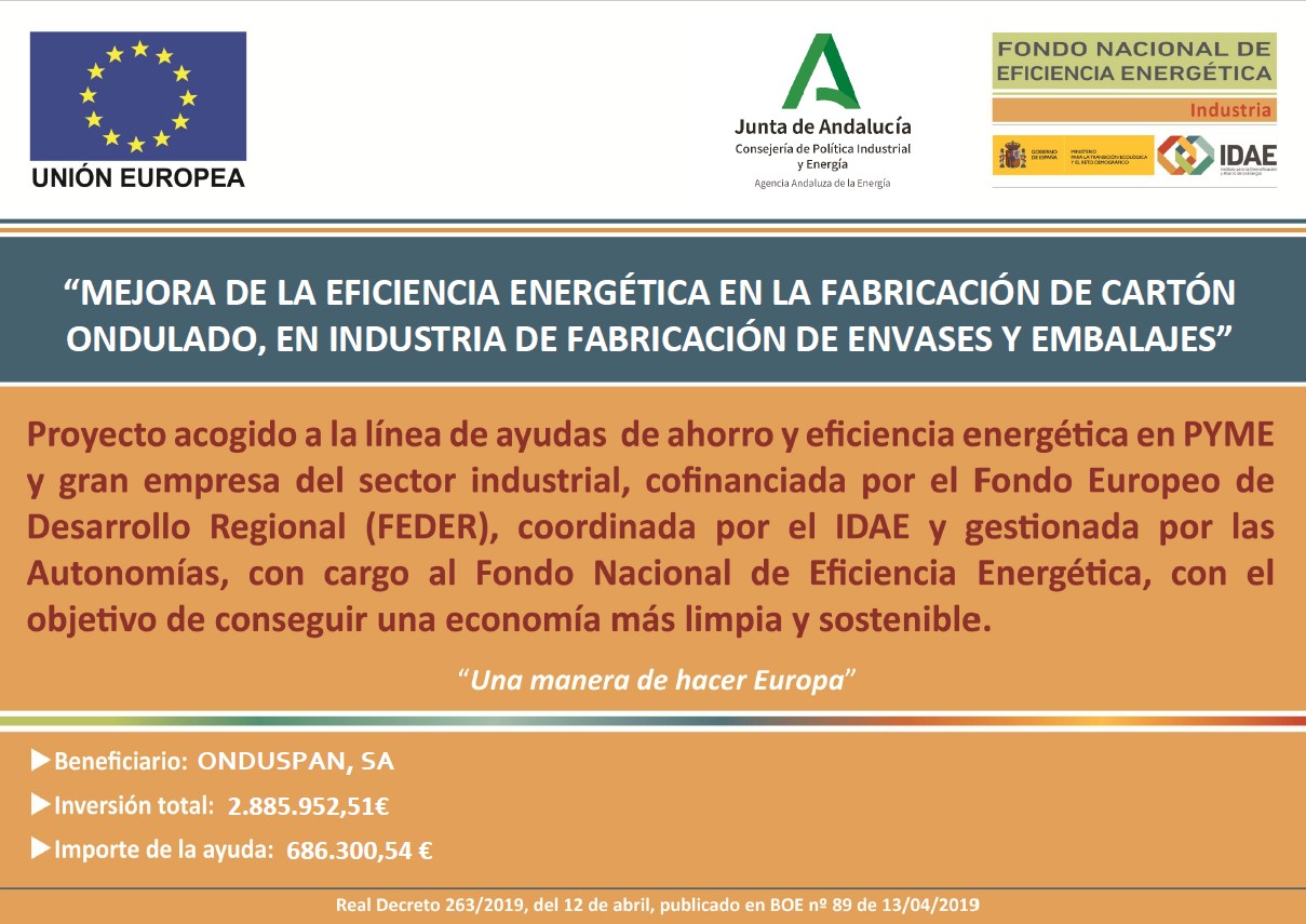 ONDUSPAN, S.A. ha recibido una ayuda para su proyecto de ahorro y eficiencia energética “Incremento de la eficiencia energética en el proceso de fabricación de embalajes de cartón ondulado” cofinanciada por el Fondo Europeo de Desarrollo Regional (FEDER), coordinada por IDAE y gestionada por las autonomías, con cargo al Fondo Nacional de Eficiencia Energética, con el objetivo de conseguir una economía más limpia y sostenible. Se ha elaborado un proyecto de ahorro y eficiencia energética consistente en la incorporación de nuevos equipos adicionales a la línea con el único fin de reducir el consumo específico de energía. Los equipos incorporados (fondo verde) permitirán aumentar la velocidad, eliminar el cuello de botella y aumentar notablemente la producción con solo un ligero aumento de la energía consumida. Se ha requerido la colaboración de los mejores fabricantes de equipamiento del sector, que nos aportarán grandes ahorros energéticos y medioambientales en el proceso. Gracias al proyecto se ahorran 299,65 teps anuales.